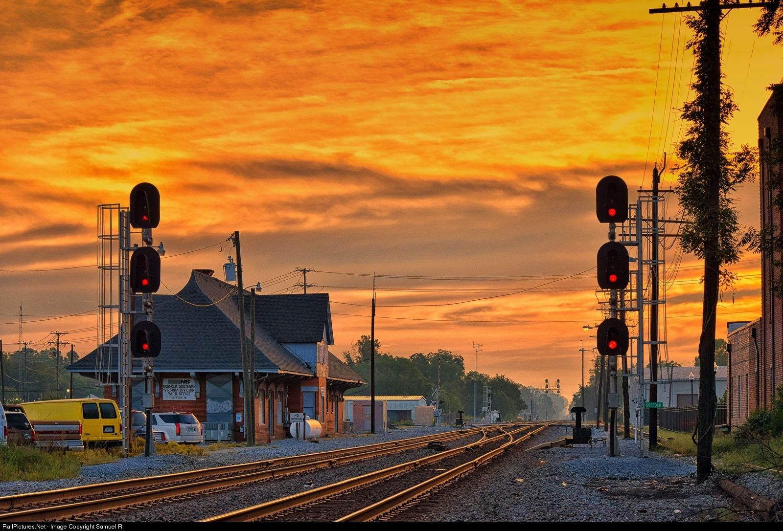 A very colorful sunrise appears over the Norfolk Southern Virginia Division yard office, originally built as a Norfolk and Western station, along the right-of-way of the NS Norfolk District in downtown Suffolk, VA.