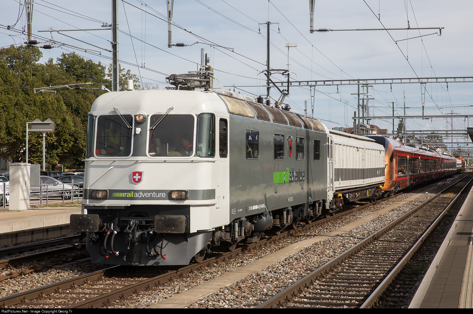 The Railadventure company bought from the SBB the former Re 6/6 # 11603 "Wädenswil", one of the 4 prototypes of the series, built in 1972 by SLM, BBC and SAAS. Now it is in service in a brand new paint scheme and designated Re 620 # 003 "Schweiz Svizra Suisse Svizzera". The locomotive will be used mainly for transfer runs of brand new vehicles from the works to the costumers or to test sites, for example for StadlerRail. Here it is ready for departure at Weinfelden with train 44086 to Basel Bad Bf via Winterthur-Bülach-Koblenz, pulling between coupling cars the new RABe 526 # 101/201 "Traverso" (Flirt 3 type) of the Südostbahn, and the one meter gauge Be 4/10 "Worbla 02" for the RBS, which is loaded onto 5 "Loco Buggies", specially built by RailAdventure for this purpose. This new vehicles from StadlerRail will go to Berlin for the Innotrans exhibition.