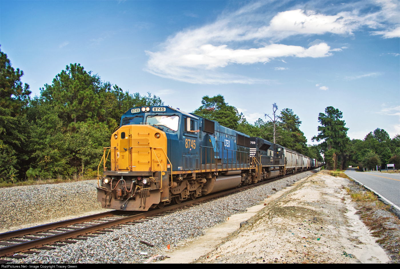| Friendly Crew. The conductor on this SD60I gives a friendly wave as 191 heads down the Southern/NS R-Line on the way to Augusta, GA. This LTEX SD60I is one of five former Conrail units that have been leased by NS after service with CSX. Unfortunately, the marker lights have been removed. |