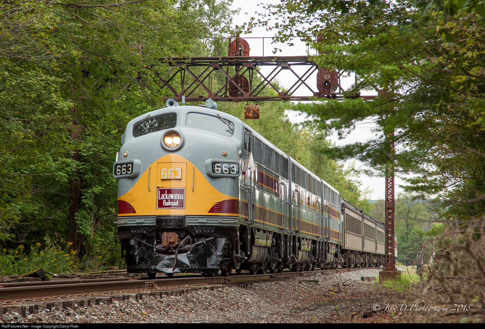 While the rest of the photoline was set up behind the trees to the right, a small group of us decided we wanted to go for something with more Lackawanna feel to it at Elmhurst, PA, and what better prop than an old signal bridge. So here, the ARHS convention train passes under the old signals at Elmhurst with the trio of F3s in charge.