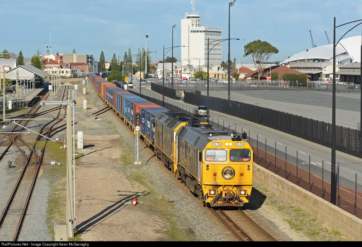 | With Watco Australia's ILS container train running on its' earlier table from Forrestfield, 3142 led by FL220 & G511 passes through Fremantle with loaded containers for North Quay. |