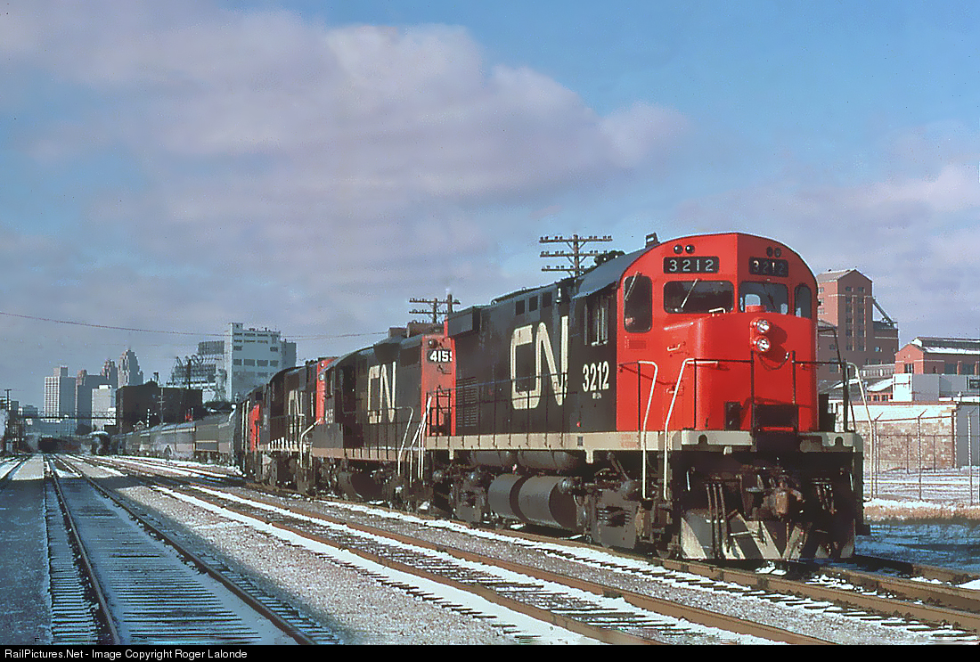 | CN Rail MLW C424 3212, GMD GP9 4159, MLW RS18 3879, MLW FPA4 6763 and MLW FPB 4 6866 at Windsor, Ontario train station. |