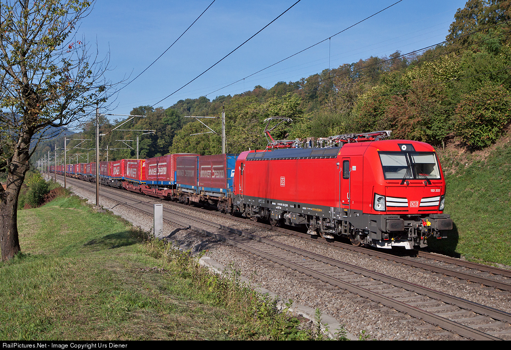 | The new Siemens Vectron Multisystem locomotive 193 333, delivered in July 2018 to DB Cargo, is pulling the "Winner Spedition" intermodal train 41051 from Wuppertal Lagerfeld (Germany) to Piacenza (Italy). |
