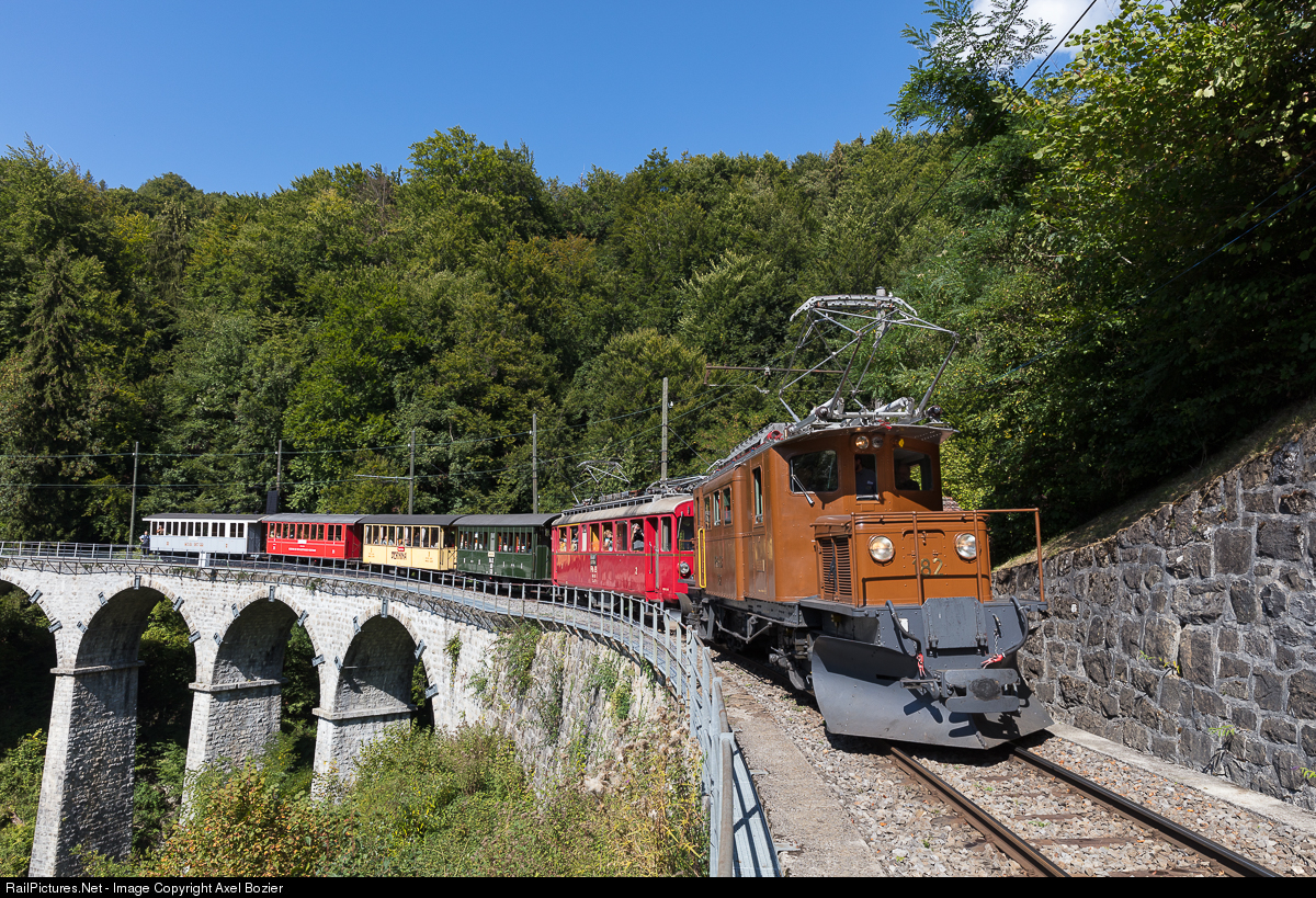 "Mega Bernina Festival" on the Blonay-Chamby museum railroad, which celebrates this year its 50st anniversary. "Bernina Crocodile" Ge 4/4 #182 of the Rhaetian Railway RhB, a "guest locomotive" of the festival, and electric railcar ABe 4/4 #35 with 4 passenger cars just crossed the viaduct over the "Baye de Clarens".