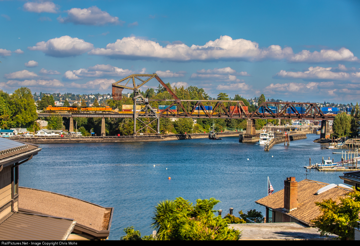 | If you love trains and you love boats and ships and have a multi million dollar budget this is the place to have a home. BNSF Bridge No. 4 across Salmon Bay is a single leaf bascule bridge that carries the BNSF Mainline north and south. The ship canal and Salmon Bay see's all manner of Yachts, Fishing Boats, and Cargo Shipping. Here a stack train is northbound across the bridge while below Yachts await the locks to open to continue up the Ship Canal. |