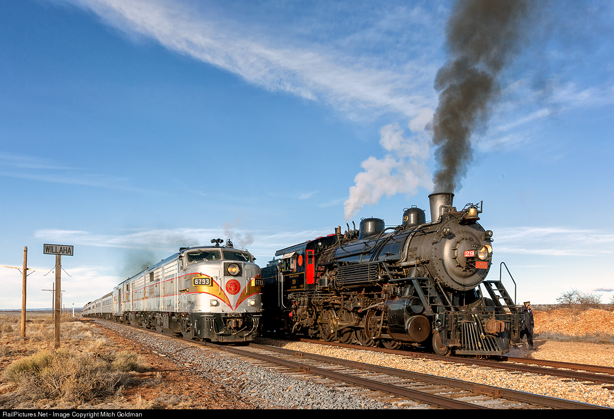 Grand Canyon Railway's beautifully liveried MILW FPA's - both an FPA-4 unit and an FPB-4 unit, pull a matching consist through Willaha, AZ, on the railroad's regular excursion, passing the railroad's 2-8--0 No. 29 steam locomotive. The MLW FPA-4's were ran as a favor during a Lerro charter which also featured 2-8-2 No. 4960. Typically, the line utilizes much newer F40's.