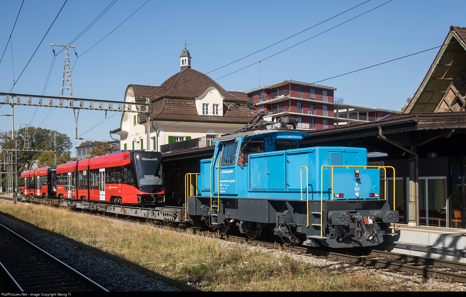 StadlerRail dual power electro/accumulator locomotive Eea 936 # 131 arrived at Gossau (SG) with 4 lowfloor carriers, transporting a brand new "Tango" ABe 4/6/Be 4/6 train # 4107/4007 for the Appenzeller Bahnen from Bussnang. The Appenzeller Bahnen ordered 11 of this one meter gauge trains for the line Trogen-Speicher-St.Gallen-Teufen-Gais-Appenzell, to replace all other vehicles on this line.