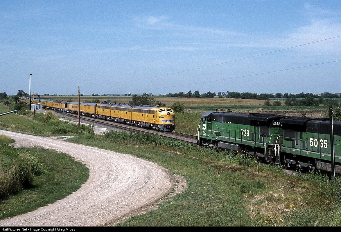 UP 951 leads a passenger excursion past a waiting coal train, led by BN 5129, at Willis KS in August of 1994. I remember it was a brutally hot day and we never turned the car off so the A/C could keep running.