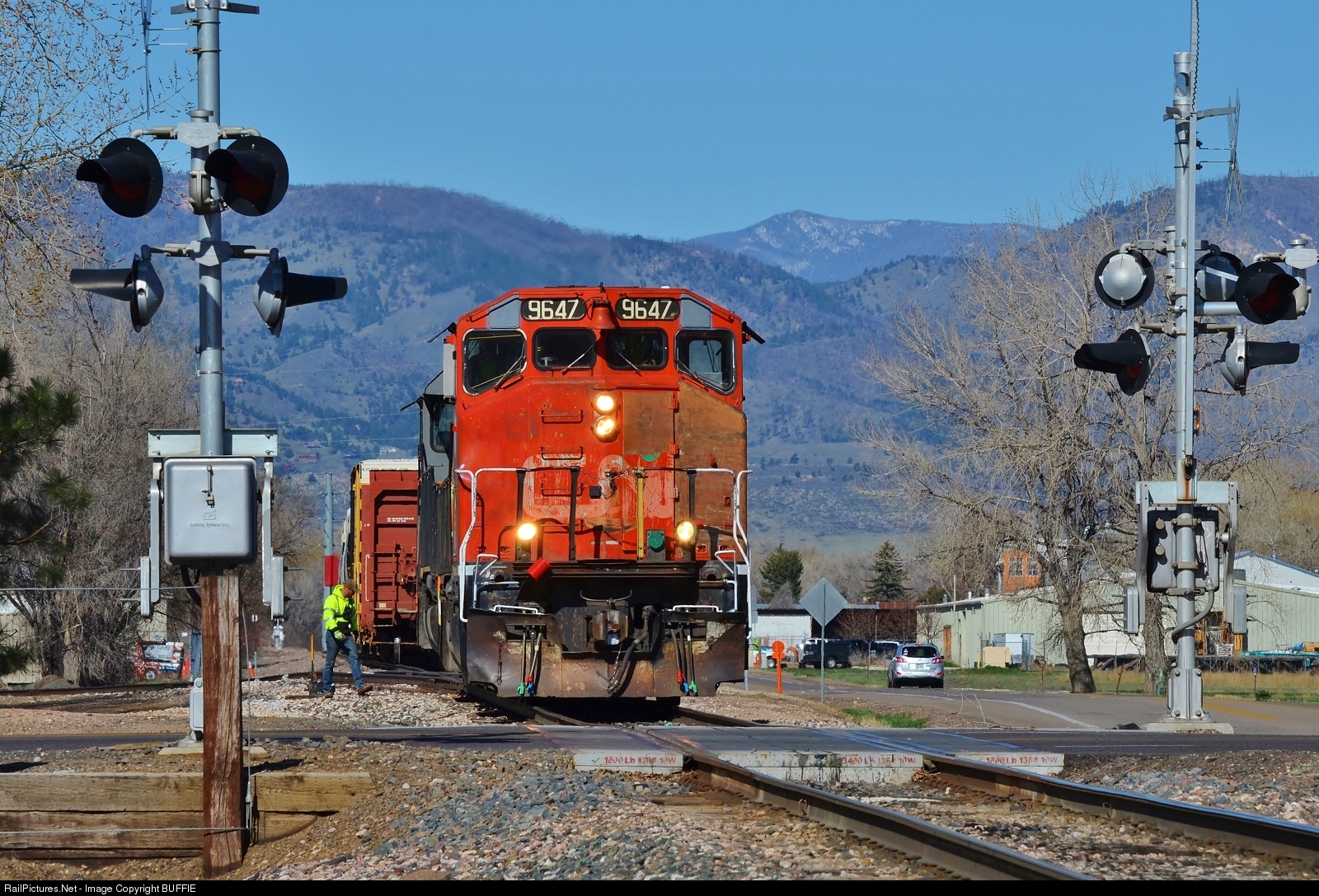 The crewman of OMLX 9647 (former Canadian National GP40-2LW) throws a switch that will allow them to bring a freight into the BNSF's North Yard in Fort Collins, Colorado.