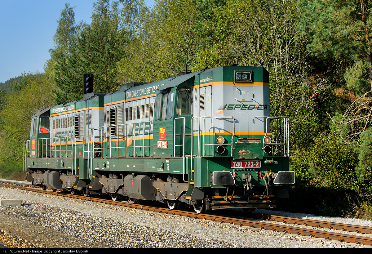 | Pair of locomotives 740 723-2 and 740 545-9 private company RM Lines, a.s. is captured at Zlata Koruna Station. |