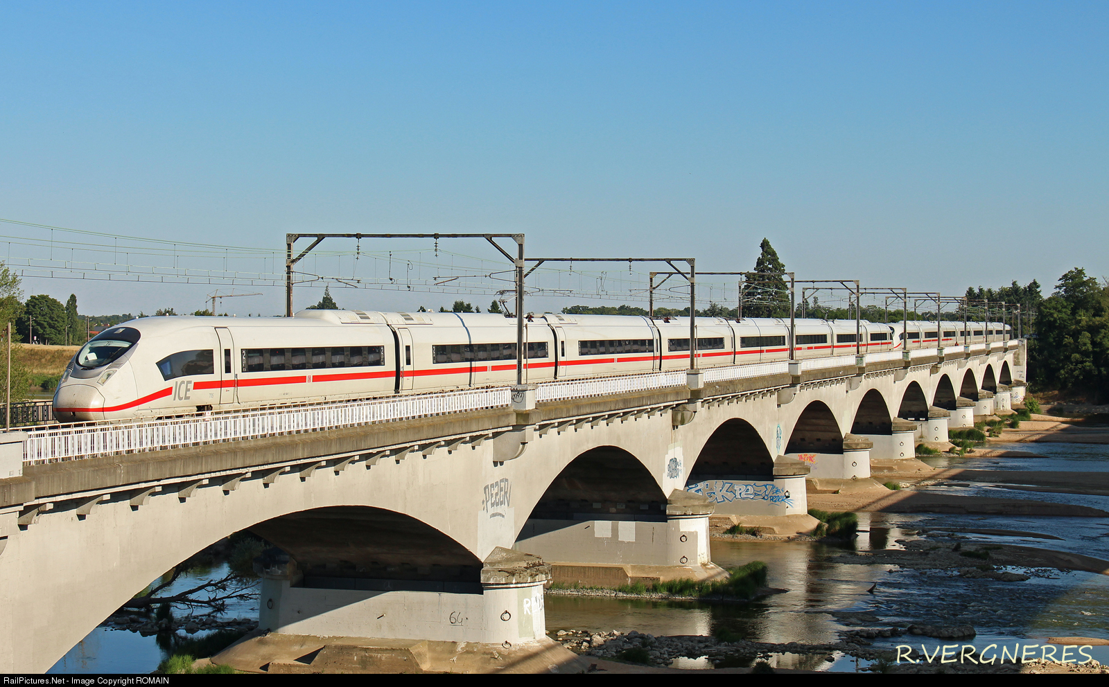 | Back from a test march between Vierzon and Les Aubrais, ICE trains 3 705 and 714 cross the Loire south of Orléans. |