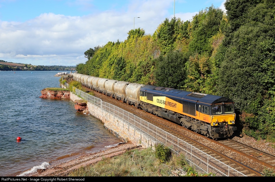 | 66847 hauls 6C36 08:00 Moorswater to Aberthaw cement works past Shaldon Bridge on Thursday 13th September 2018 This was the first time a Colas class 66 had been used on this working |