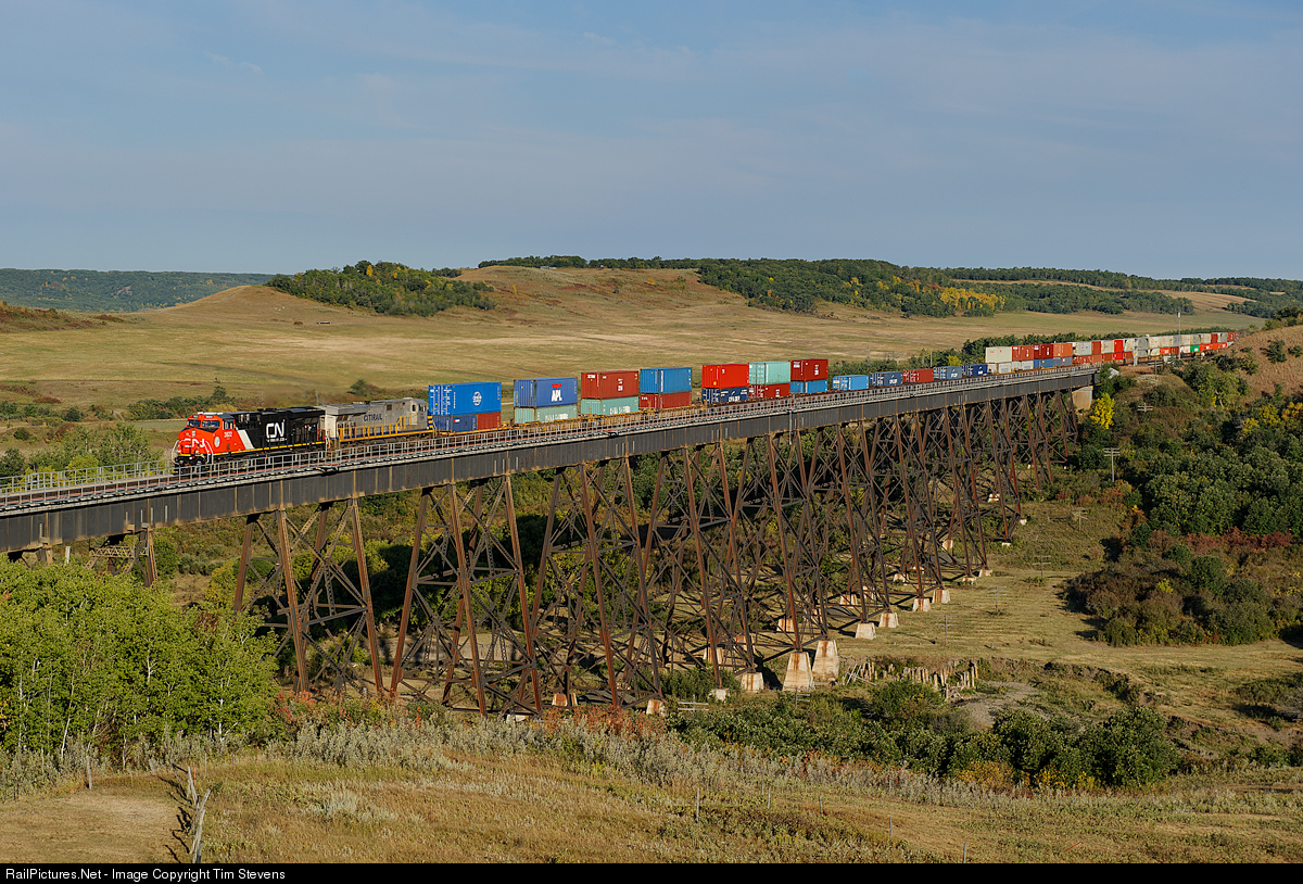 Brand new CN ES44AC 3822 and CREX ES44AC 1506 lead CN train Q108 over the Uno, MB trestle in the beautiful Assiniboine Valley.