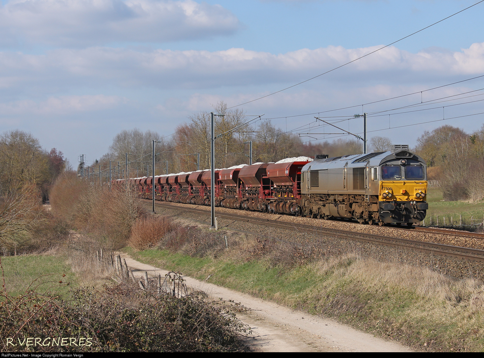 | From the quarries of L'Oraille, the Class 77506 passes Bueil, on the line Mantes la Jolie - Caen, towards Creil. |