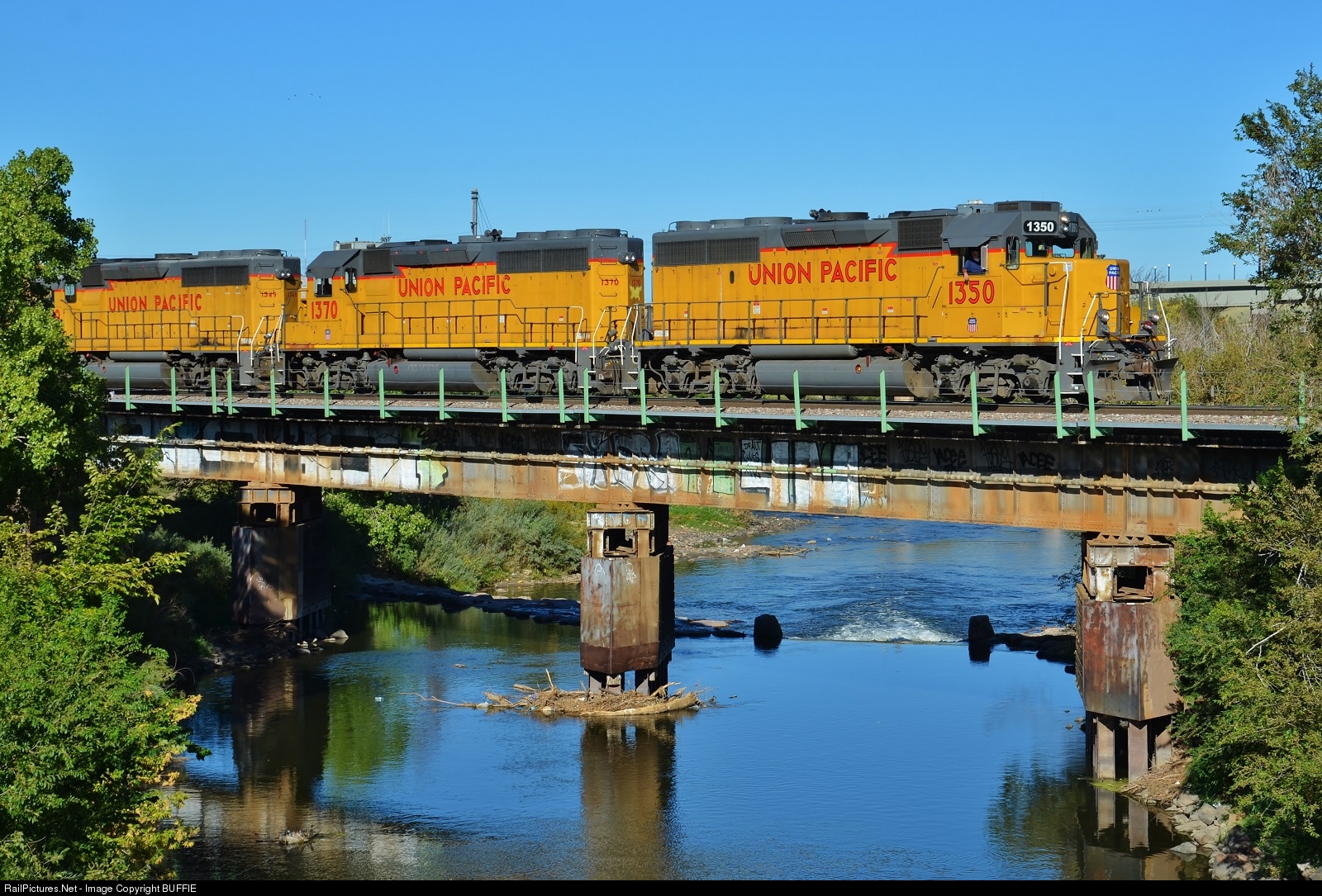 UP 1350 (ex DRGW GP40-2) leads a freight over the South Platte River in Denver.