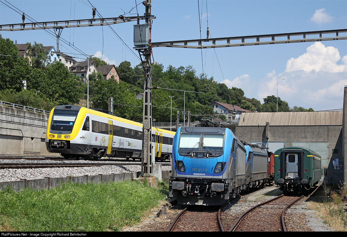 | VT 612 112 is on the way Singen - Basel. Railcars VT 612 are equipped with tilt technology. Two locomotives type 187 of Bombardier are waiting for the continuation of the journey to Germany. |