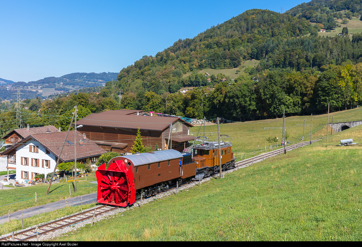 "Mega Bernina Festival" on the Blonay-Chamby museum railroad, which celebrates this year its 50st anniversary. Steam-powered snow blower Xrot d #9214 (built by SLM in 1912 for the Berninabahn as R 1052) and "Bernina Crocodile" Ge 4/4 #182 (built by SLM and SAAS in 1927), a guest locomotive of the festival, are seen during the "Bernina Parade" near Cornaux.