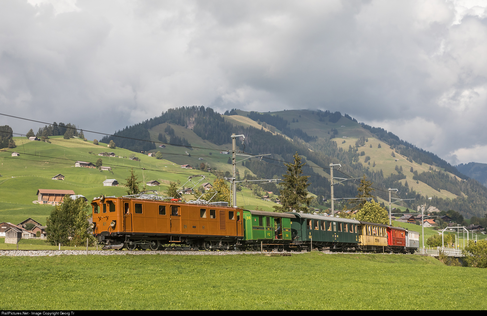Former Bernina Railway locomotive Ge 4/4 # 81, built in 1916 by SLM and BBC, since 1970 on the Blonay Chamby Railroad Museum, is pulling a special passenger train from Gstaad to Montreux on the line of the MOB (Montreux Oberland Bernois) near Flendruz, on the occasion of the "Bündnertag im Saanenland" and for celebrating 50 years of the Blonay Chamby Railroad Museum.