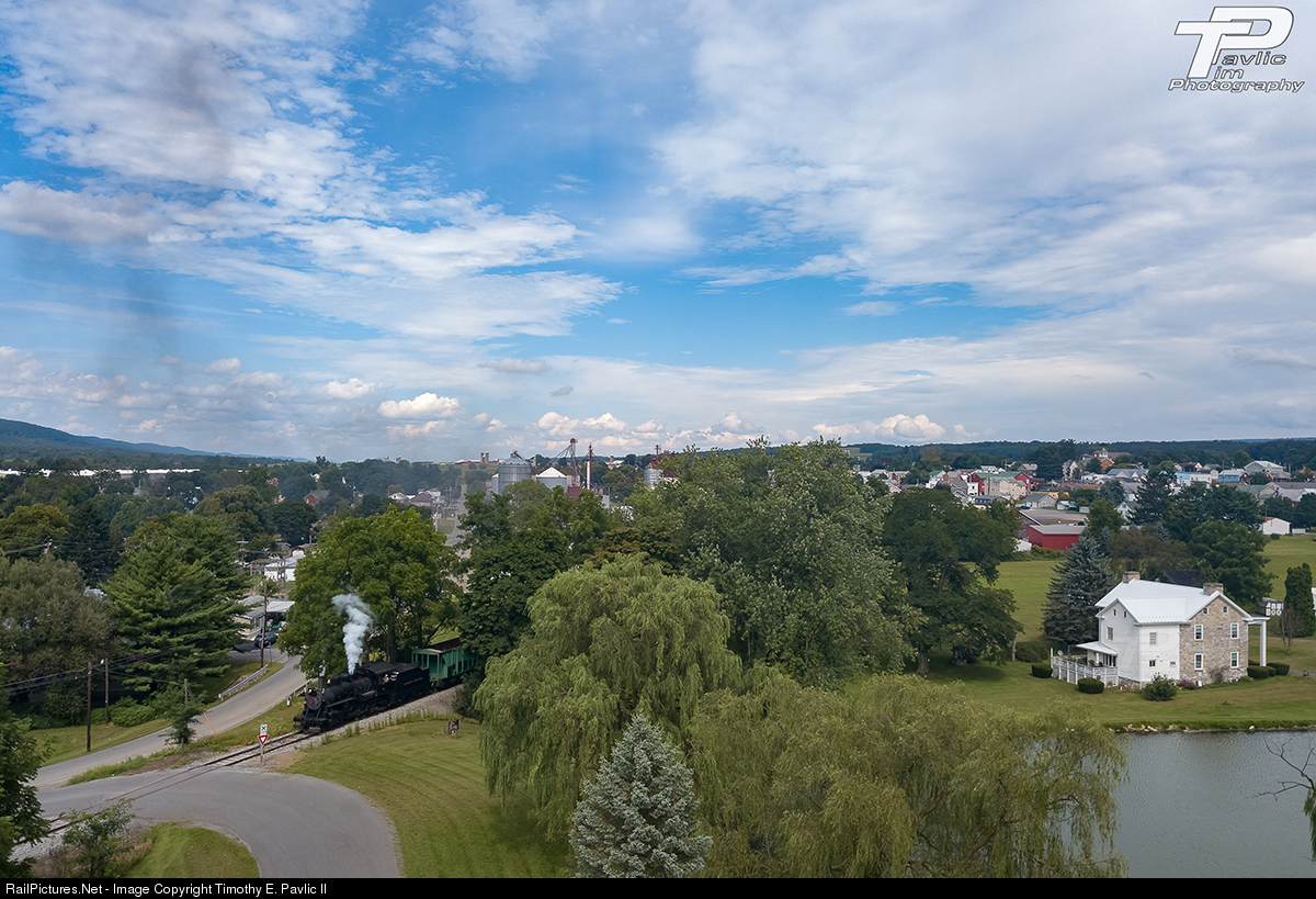 A very tight angle and a location very, very rarely photographed on the Everett Railroad in general is this small park and pond near the end of track in Martinsburg. The borough was, and still is, a farming community, and serves as the backdrop for 11 emerging from a tree tunnel.