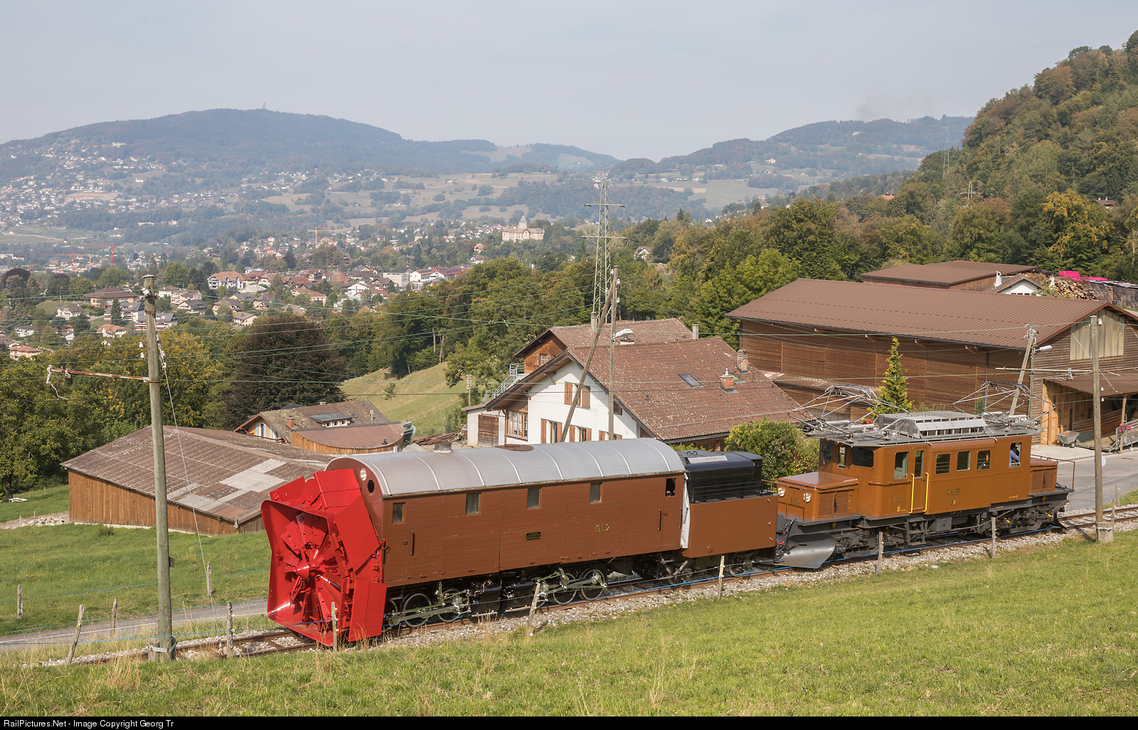 Not in Grisons, but in the western part of Switzerland, near the Cornaux stop of the Blonay-Chamby Railroad museum, celebrating the 50th anniversary. Self propelled 0-6-0+0-6-0 steam rotary snow blower X rot d # 1052 of the former Bernina Railway (not operational) shoved by "Bernina Crocodile" Ge 4/4 # 182 of the Rhaetian Railway, on a visit during the MEGA BERNINA festival.