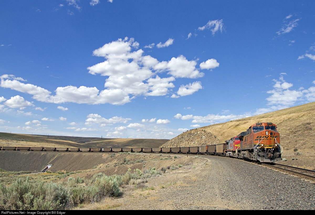 | BNSF 6175 and a red and silver Dash 9 head an empty coal train around Trinidad Loop on their climb from the Columbia River up to Quincy, WA. The train re-crewed at Wenatchee and is headed to Hauser, ID. |