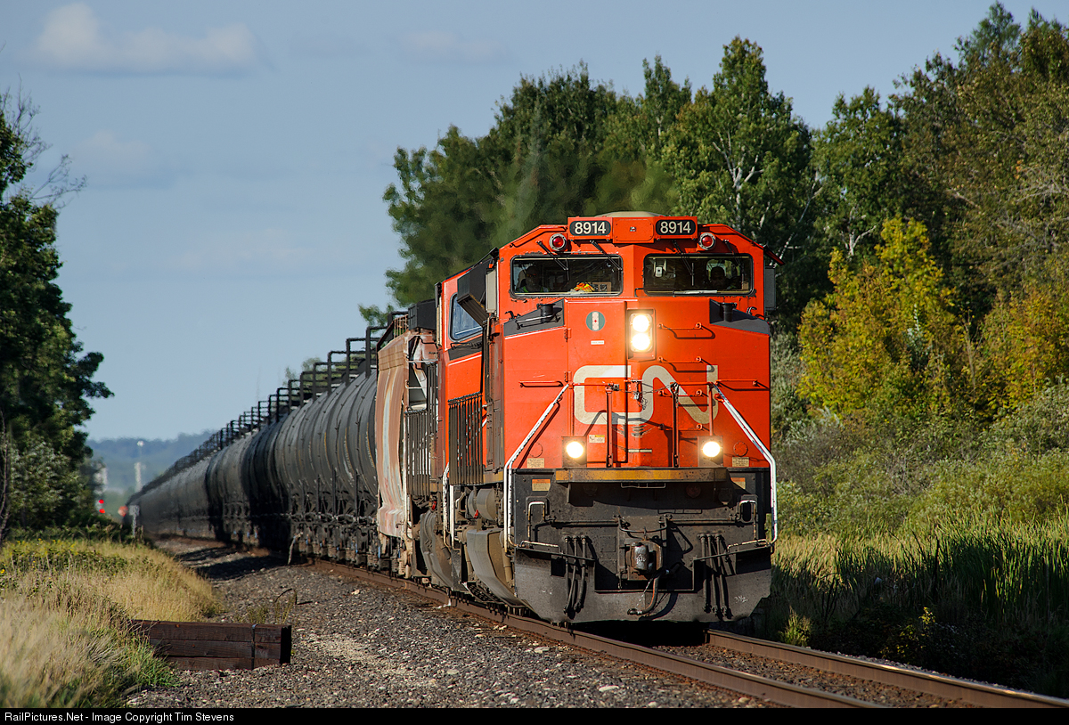 CN SD70M-2 8914 leads a loaded crude oil train south on the Rainy Sub.