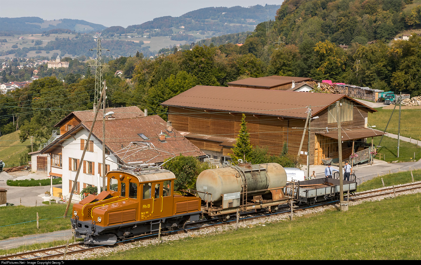 Not in Grisons, but in the western part of Switzerland, near the Cornaux stop of the Blonay-Chamby Railroad museum, celebrating the 50th anniversary. "Asnin" (little donkey) Ge 2/2 # 161 of the Rhaeetian Railway, on a visit during the MEGA BERNINA FESTIVAL, with a short freight.