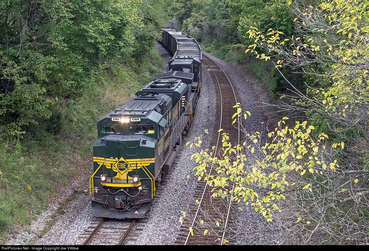 A bit of autumn color is starting to show as the Erie heritage unit has taken the siding at Tazwell leading a westbound coal empty.