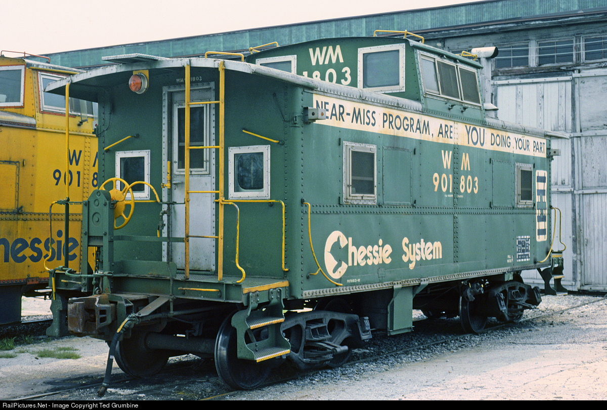 It was one of 23 Chessie System safety cabooses, and one of only four rostered by the WM (the others being 1802, 1806 and 1811). Its first safety paint scheme (10/15/1976) had a relatively small white banner for the slogan, barely wider than the cupola, and a large, centered Chessie System logo. In the second iteration (05/1982), the slogan (sans question mark) and banner was extended to nearly the full length of the carbody, the “Chessie System” herald was reduced in size and shifted toward the end of the car, and the cross/track safety emblem was added.