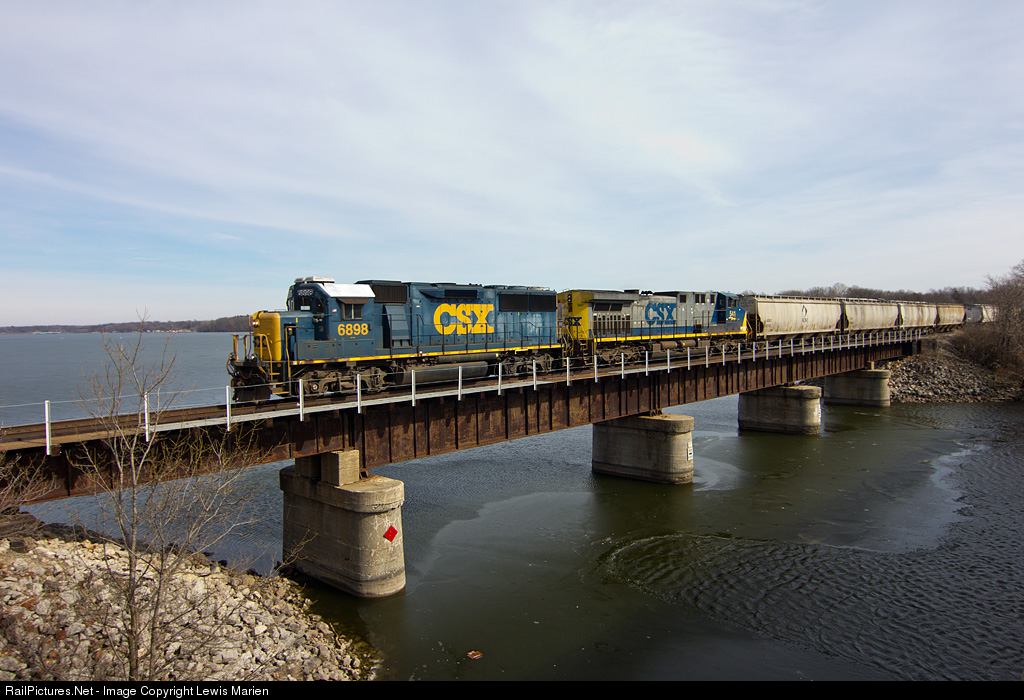 CSX J713 from Danville, Ill., crosses Lake Decatur with a GP60 (a rarity on the railroad's roster) in the lead on February 18, 2018. CSX Transportation has since sold the Decatur Subdivision, as well as their Danville Secondary Subdivision, to Watco's new Decatur & Eastern Illinois Railroad (DREI) who began running over this former Baltimore & Ohio line in early September 2018.