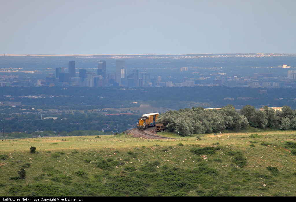 Rounding Big 10 Curve west of Rocky, Colorado, is a westbound Union Pacific manifest freight with lone DPU GE AC4400CW No. 6216 shoving hard on the rear on the afternoon of June 20, 2018. In the background and 16 miles away “as the crow flies” are downtown buildings of the city of Denver.