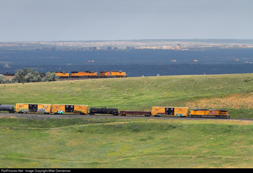 A westbound Union Pacific manifest freight climbs the mesa where Big 10 Curve is located on the climb up the front Range of Colorado’s Rocky Mountains on the afternoon of June 20, 2018. The head end has just passed the hopper car wind break of the curve and is approaching the east switch of Eisele siding, while the rear of the train is below still headed for the curve assisted by lone DPU climbing the two-percent grade out of Rocky.