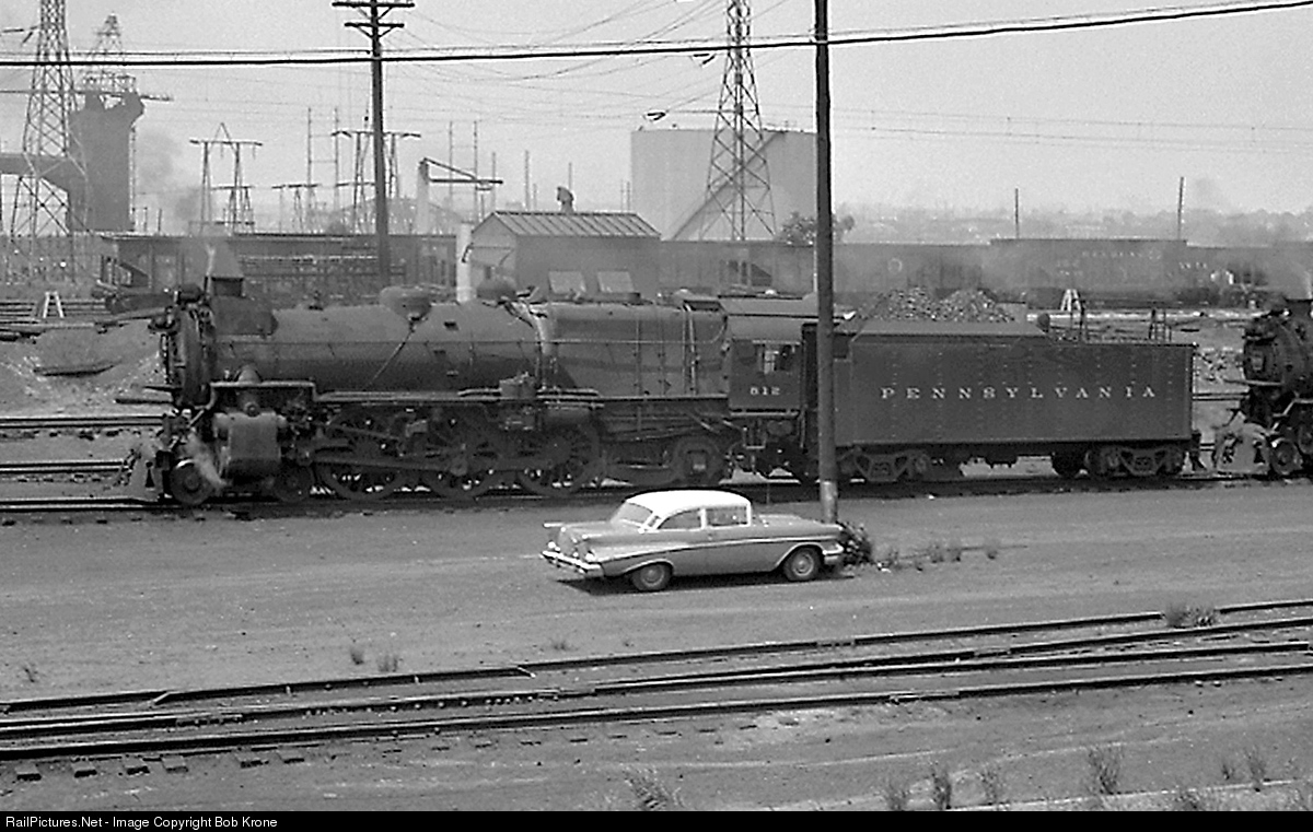 A rediscovered negative shows PRR K4sa 612 sitting at the South Amboy engine terminal on a hot June day. The engine had arrived early with a 12 car train from Bay Head. K4s 5379 sits behind. An employee's 1957 Chevrolet adds nice definition in this last year of PRR steam.