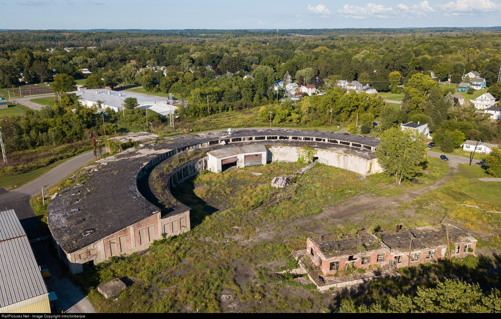 Recent tree and brush clearing work has made possible this aerial view of the abandoned roundhouse at the Lehigh Valley's former Manchester Yard. The yard was one of the largest classification yards in the northeast, and was abandoned in the 1970s when the Lehigh Valley mainline was removed through upstate New York.