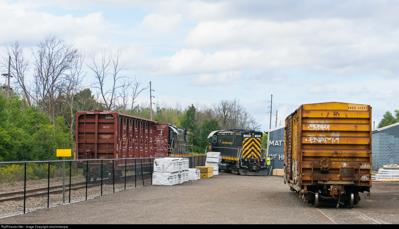 The LA&L uses a pair of Alcos to switch lumber cars at Matthews & Fields Lumber in Henrietta, New York. The crew has picked up the empty centerbeam and dropped a loaded boxcar, and the conductor now rides out on LAL 428 to put the outbound train back together.