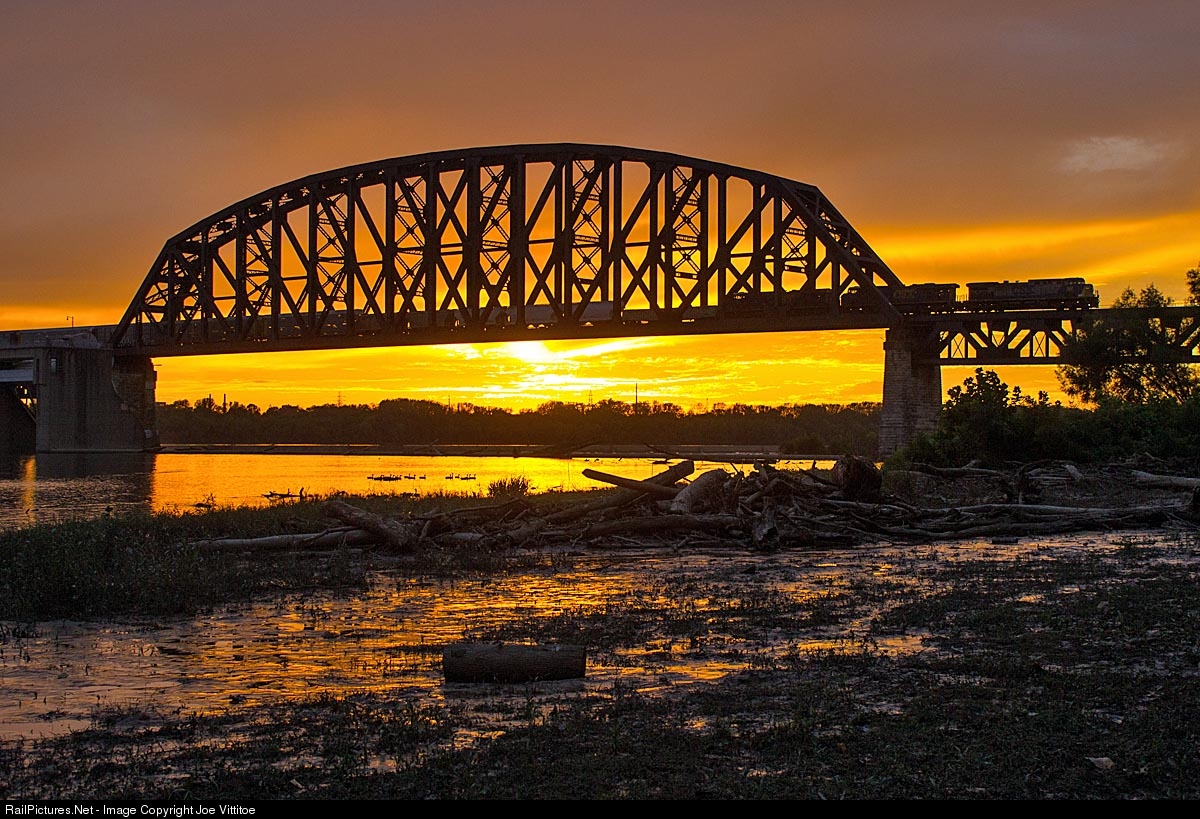 A northbound CSX Q train crosses the Ohio River into Indiana as the sun sets in the west.