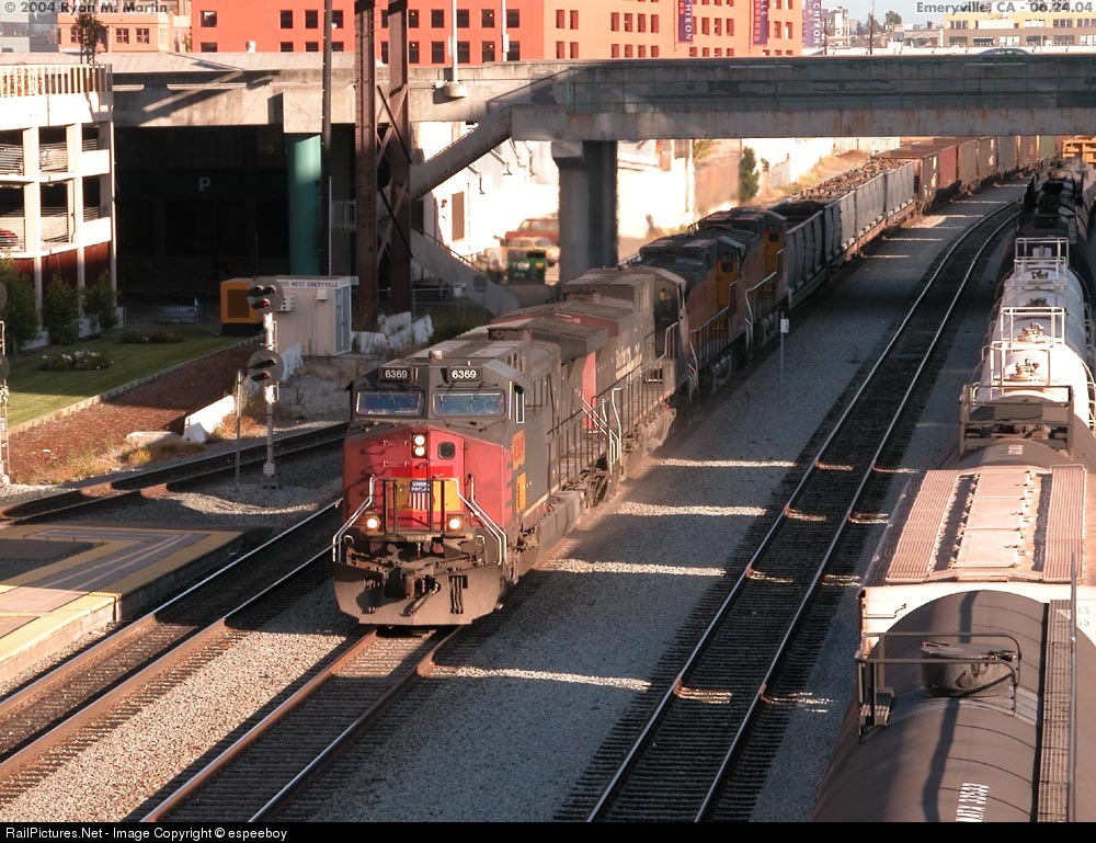 | Patched UP6359 (ex-SP314) leads a rare empty coal train with some used RR tie container cars at Emeryville Station. A semi-tough shot to frame with most of the mainline covered in various shadows and the train approaching 60mph. |