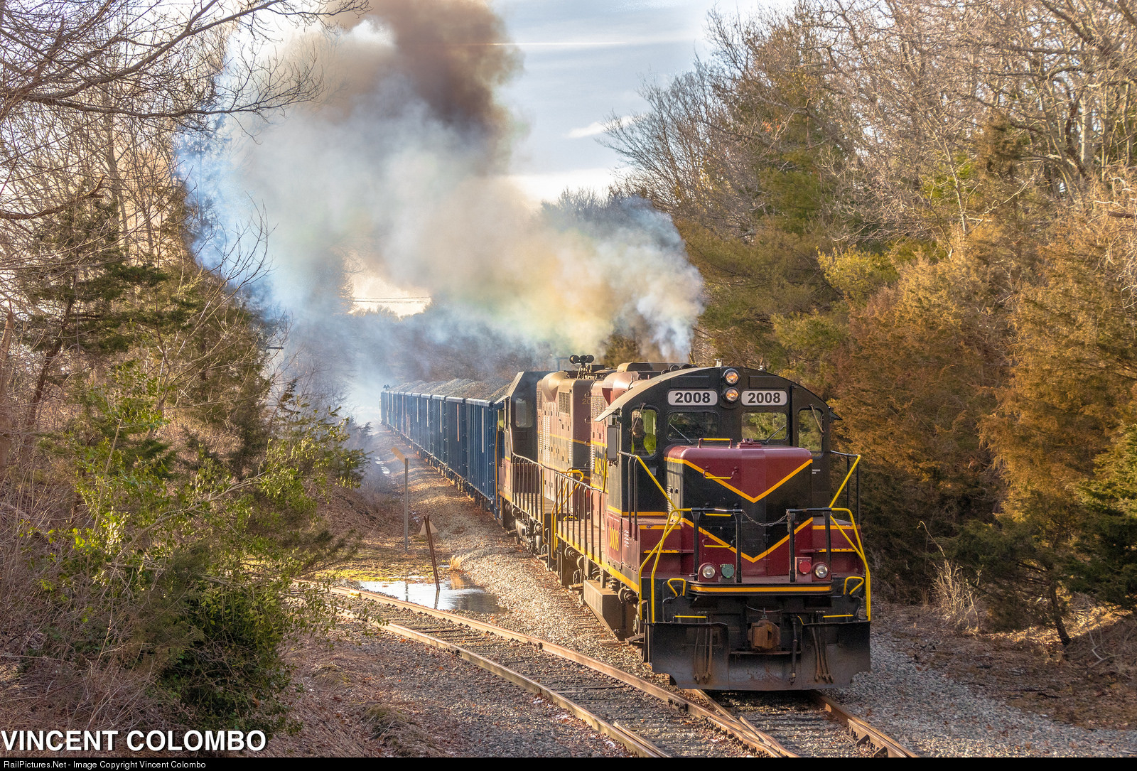 | Mass Coastal 2008 and 2007 pull a loaded ballast train past a spur that leads to Ocean Spray in Middleboro. The two GP9s are working hard getting the train up to speed. Behind the engines are twelve Mass Dot ballast hoppers and a privately-owned New York Central caboose used as a shoving platform. |