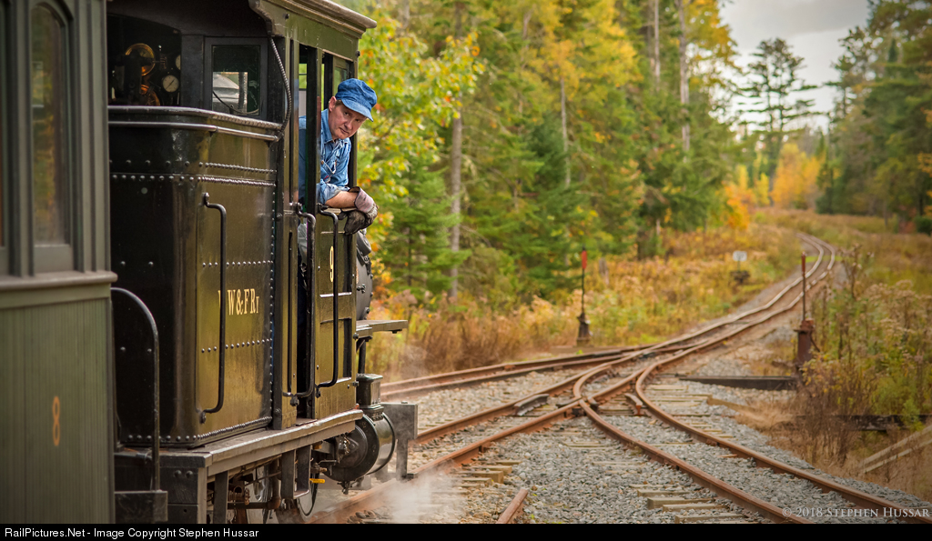 On a mid-October day in midcoast Maine, WW&F engineer Wes Carpenter glances back toward his conductor, during a scheduled stop at "Top of the Mountain." The museum's October Work Weekend is almost upon us. This October 5th thru 8th (2018), volunteers from all over will construct 1,400+ feet of new main line track -down the mountain!