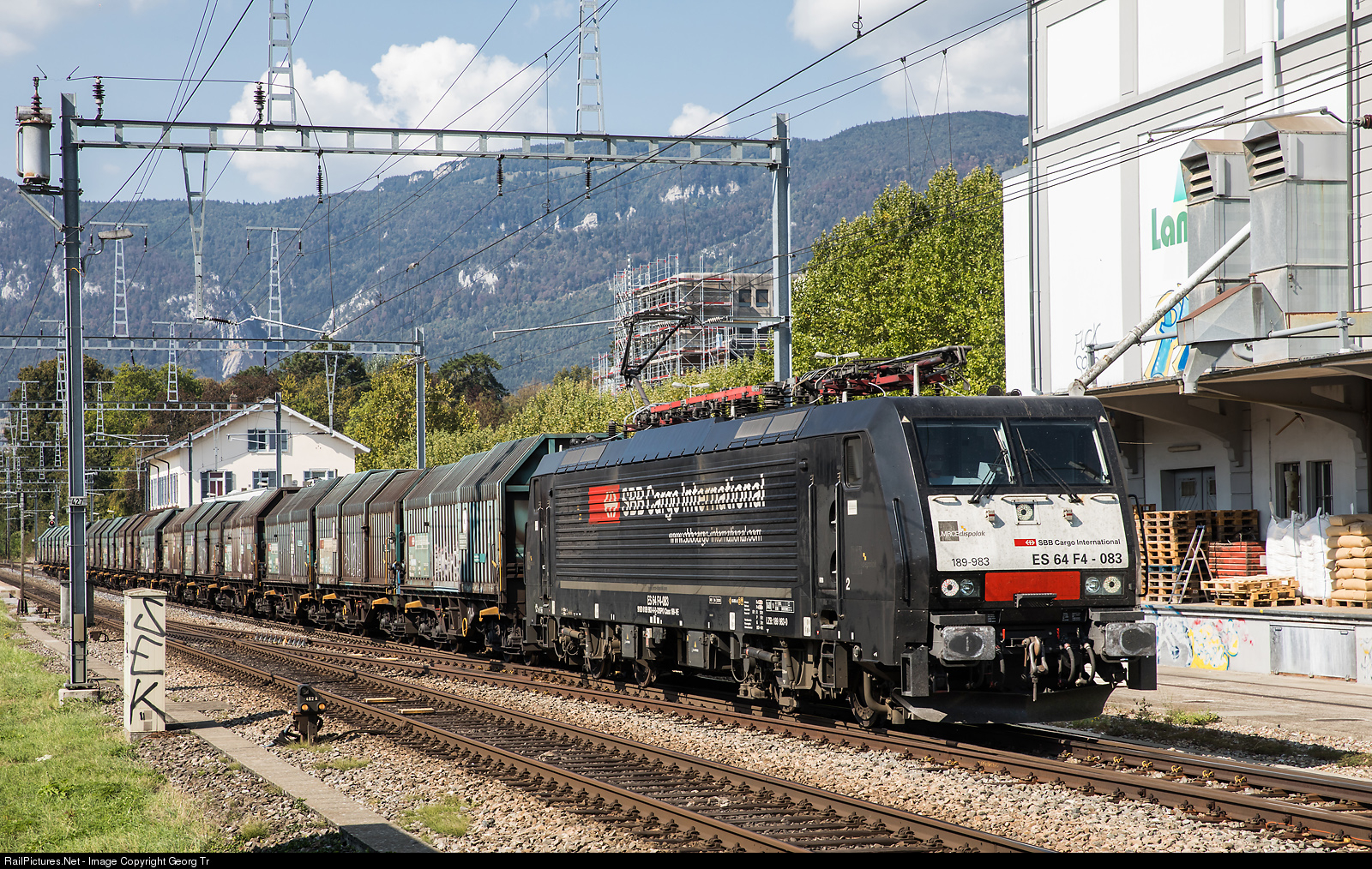 | Siemens ES 64 F4 # 083 of MRCE, rented by SBB Cargo International, is pulling the NOVELIS aluminium train 68740 from Sierre via Lausanne-Olten-Basel to Göttingen, running through Solothurn West. |