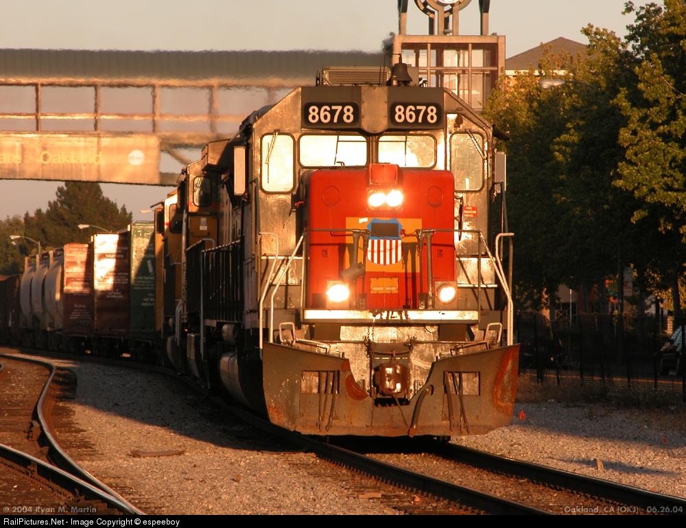Running through the station at Jack London Sq. (OKJ). Its a good thing that UP nose herald has his blind-fold on because that sun must be blinding!