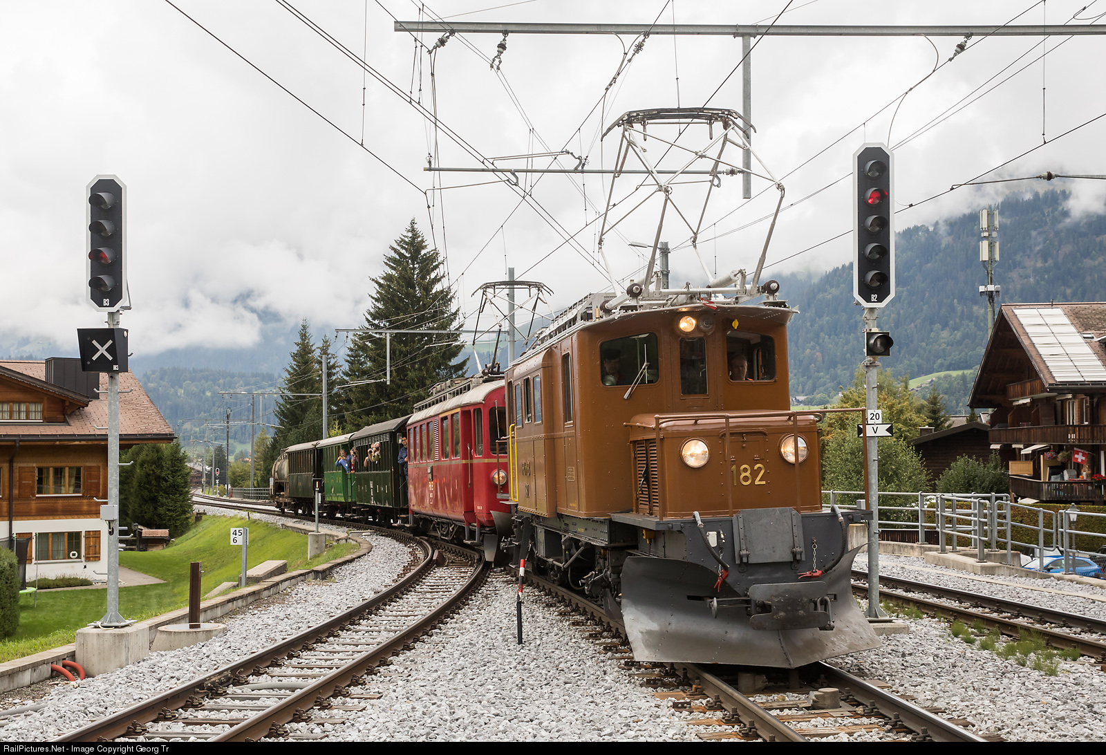"Bernina Crocodile" Ge 4/4 # 182 of the RhB is guest for some weeks at the Blonay-Chamby Railroad Museum, to celebrate 50 years of service. On the occasion of the "Bündnertag im Saanenlad" event, the locomotive is pulling a charter train from Bulle via Montbovon to Gstaad, together with former Bernina Railway railcar ABe 4/4 # 35, which is running for the Blonay-Chamby since 2010.