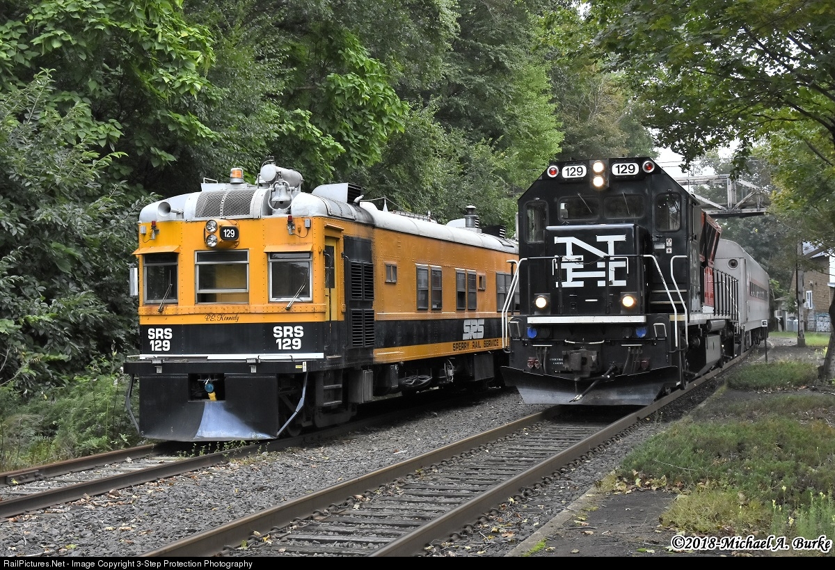 | New Haven (CDOT) BL20GH 129 heads train 1934 towards Waterbury, as it passes Sperry Rail Service inspection car 129 "P.E. Kennedy", which is tied down on the Kerite siding in Seymour. The former doodlebug was built by the St. Louis Car Co. in July of 1925 for the Lehigh Valley as their number 29. |