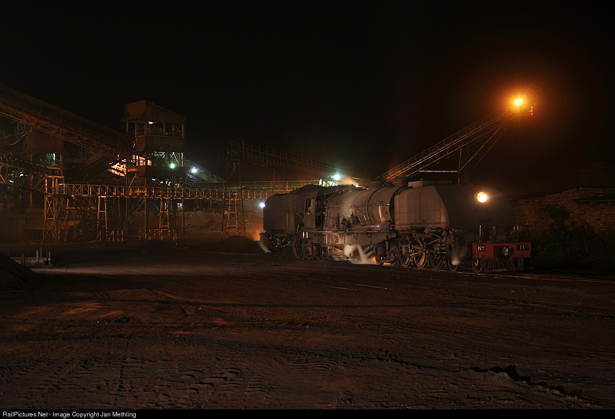 an ex. NRZ class 15A as shunting locomotive in the Hwange coal mine, seen here No. 11 in a night-shot under the loading plant