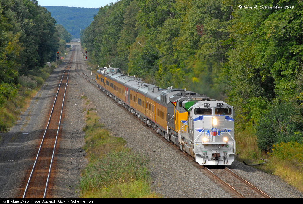 The 12 car special is seen storming up the grade after meeting two westbound intermodals at CP-FG in South Schenectady led by the glowing "Spirit" 1943 on it's second visit to NY State this year. The special visited the UP owned Railex facility and will head east to wye the train at Selkirk Yard before returning west later in the afternoon.