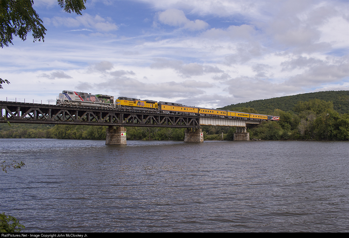 For the 2nd time in less than 6 months, the Union Pacific Office Car Special powered by UP #1943 have visited New York state. This time around, UP Executives on board made the trip from Iowa to visit the Railex facility in Rotterdam, NY where the "salad shooter" train run to. Seen here, P900 is crossing the Mohawk River as they near their destination after a long trip across the country.