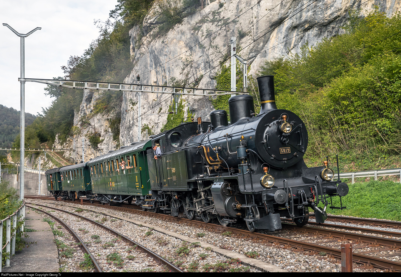 2-6-2 T steamlocomotive Eb 3/5 # 5819 "Habersack" of SBB Historic is leaving Liesberg with a wonderful contemporary passenger train from Laufen to Delémont. The cars are fouraxle third class with open platforms C4 # 9002 from 1909, third class C2 # 5906 from 1897 (built as three axle car, rebuilt by members of the Historische Eisenbahn Gesellschaft HEG at Delémont, which is now part of SBB Historic) and baggage car F2 # 17463 from 1904 (also rebuilt by HEG). The steamlocomotive is the "newest" of all vehicles, dating from 1912 and built by SLM Winterthur.