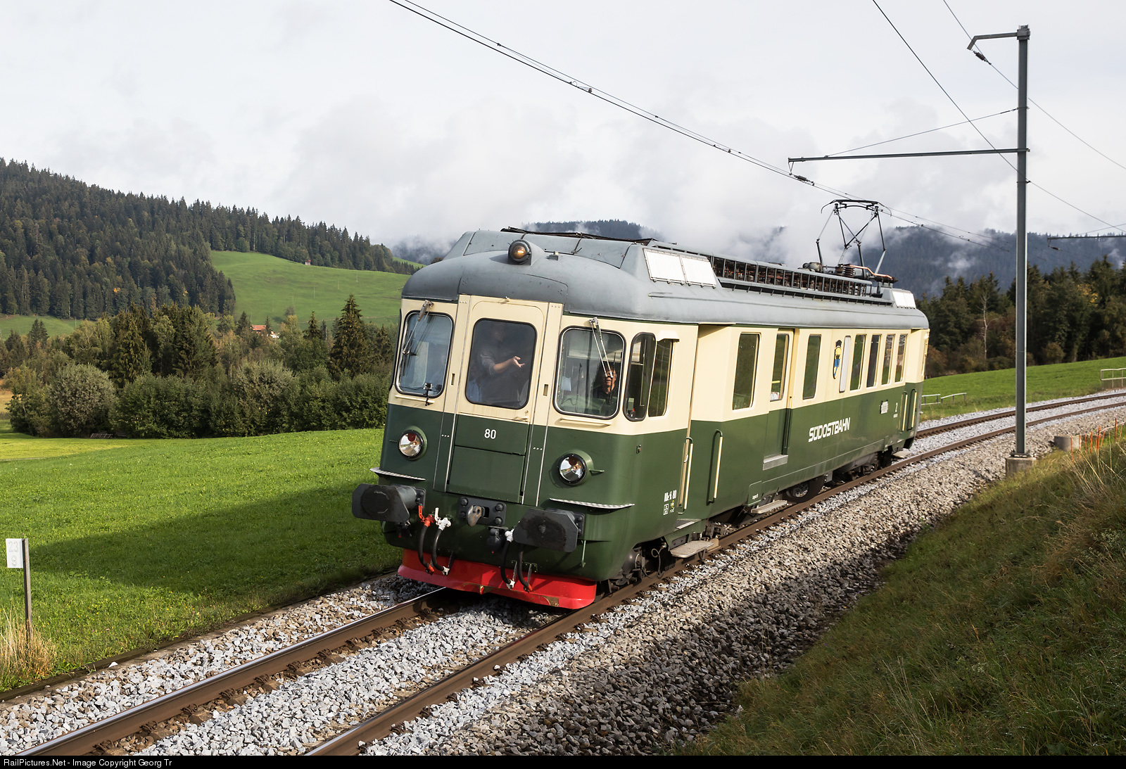 Former Südostbahn railcar BDe 4/4 # 80 (BDe 576 048) of association Depot und Schienenfahrzeuge Koblens (DSF) is on a charter trip from Zürich via Wädenswil-Biberbrugg-Arth Goldau to Luzern Verkehrshaus, then to Brunnen, and back via Arth Goldau-Rotkreuz-Othmarsingen-Baden Oberstadt back to Zürich. This vehicle was built in 1959 as ABe 4/4 # 71 "Einsiedeln" for the Schweizerische Südostbahn (SOB), was rebuilt (first class compartment removed, baggage compartment built in) in 1979 and classified as BDe 4/4 # 80, later BDe 576 # 048. When surplus for the SOB in 2008, it came to Verein Pendelzug Mirage (VPM) and 2010 to the DSF.