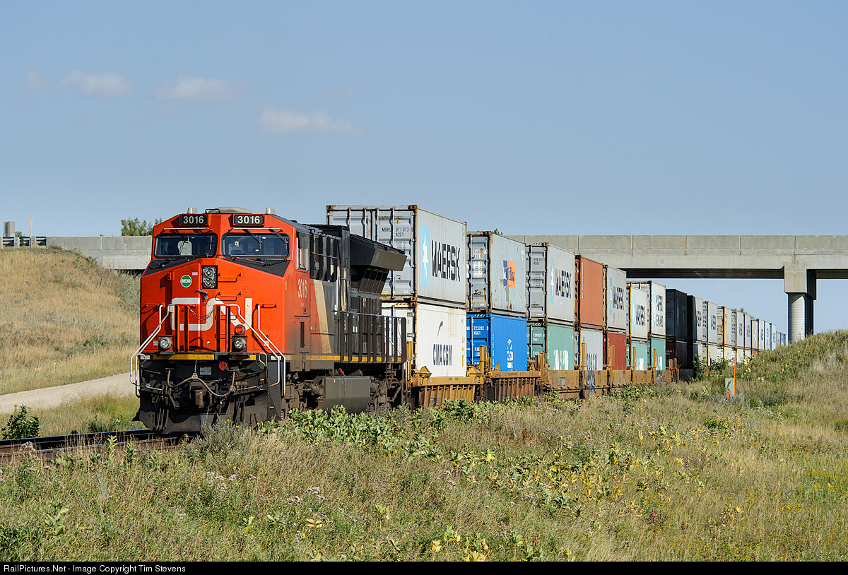 CN ET44AC 3016 shoves Prince Rupert-Chicago train Q146 under the Trans-Canada Highway #1 east of Portage la Prairie.
