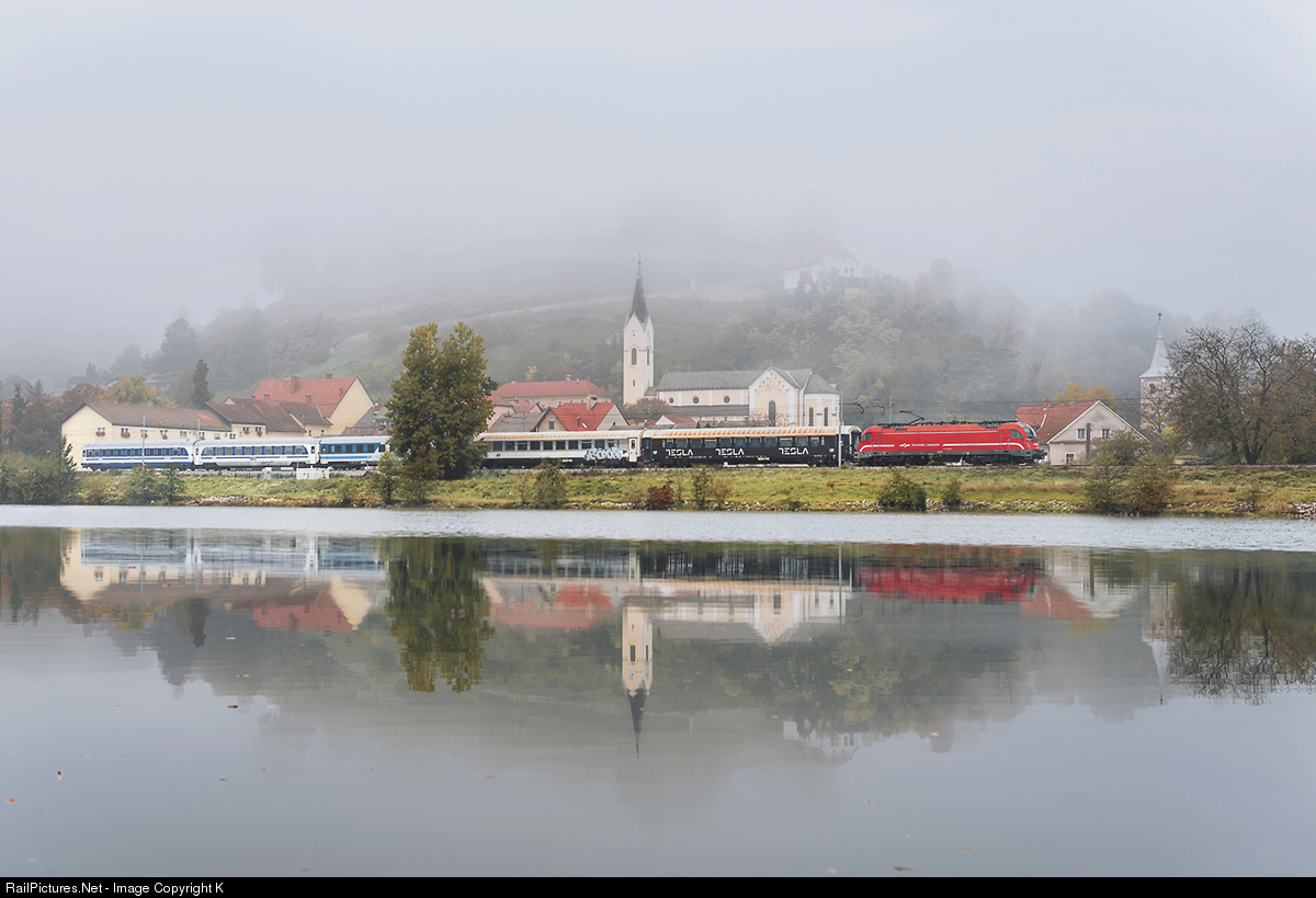 | It was time for the fog to clear, as I arrived before 7am here and this was the first train I could shoot after 10am. It is EN 415: Salzburg to Beograd sleeper. Sevnica castle hides over the fog. |
